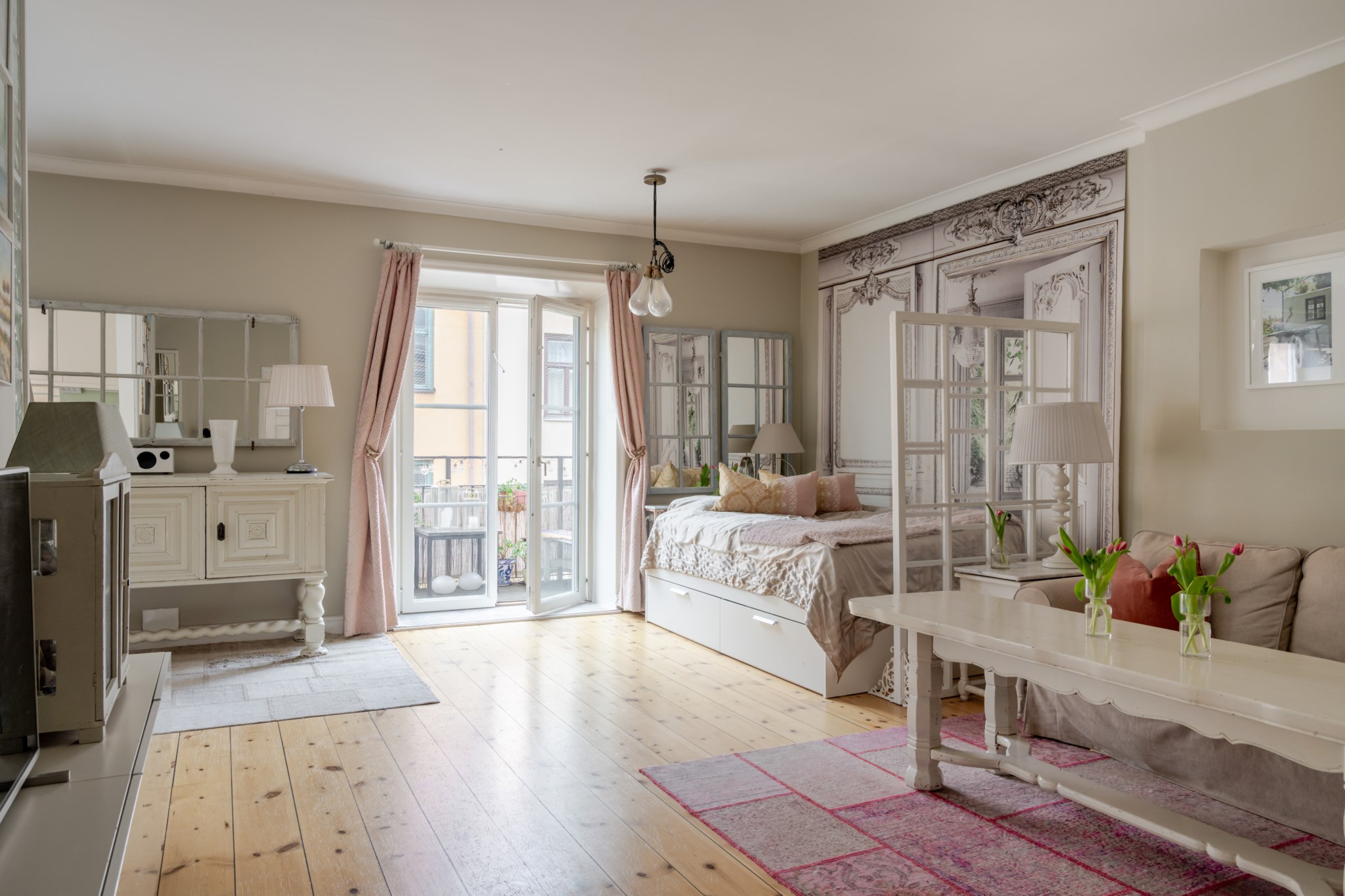 Ett stort rum som idag är avdelat som ett sovrum och ett hemmakontor.