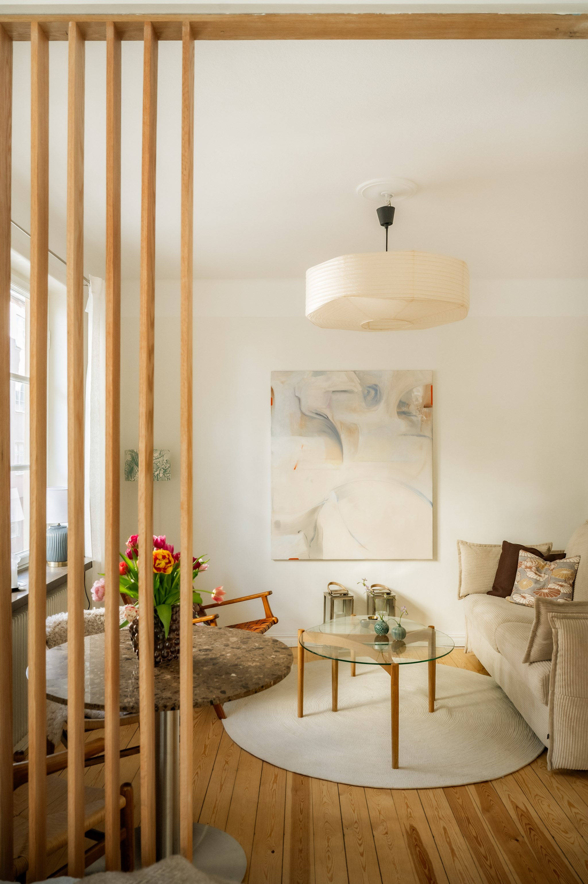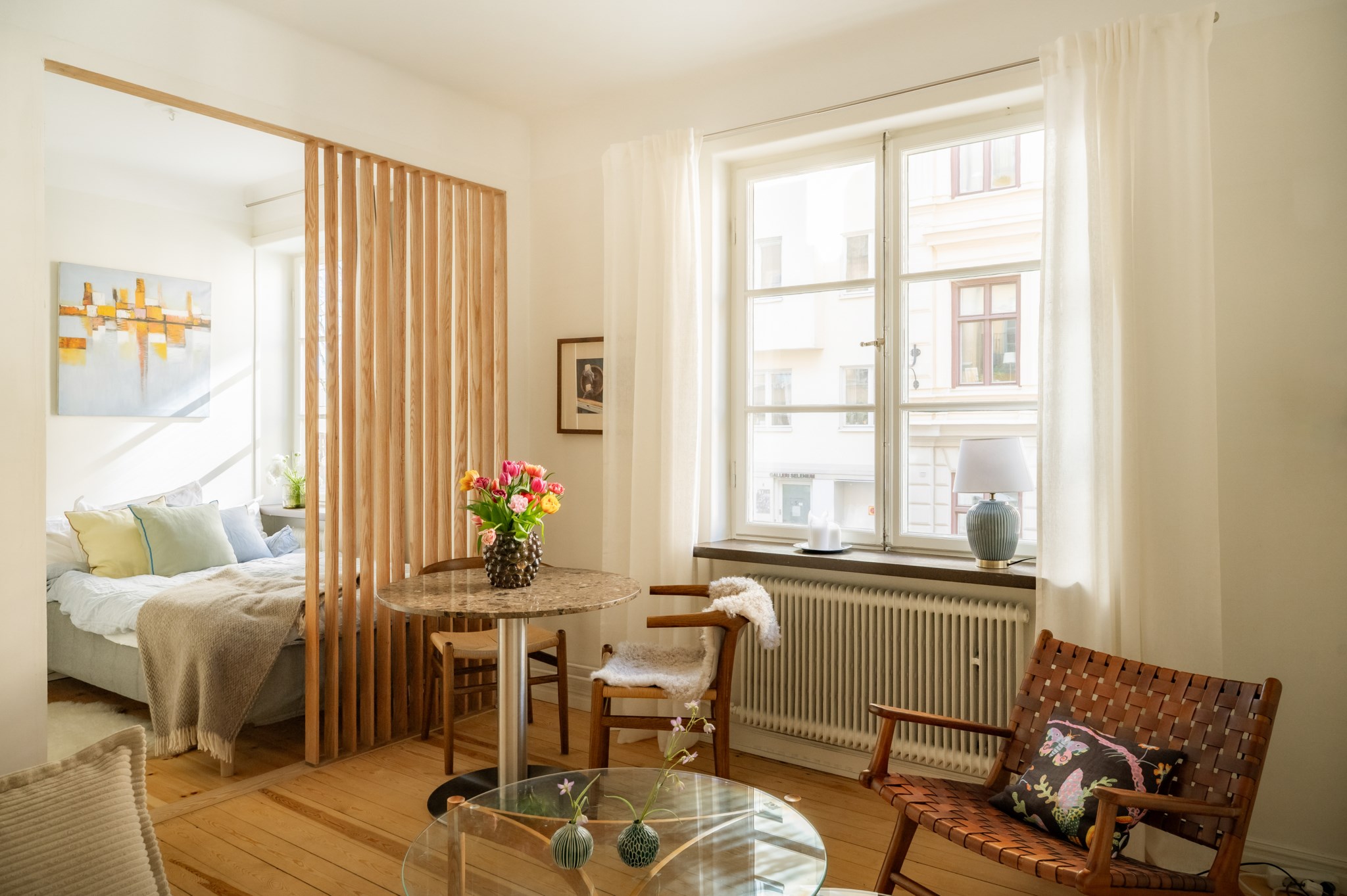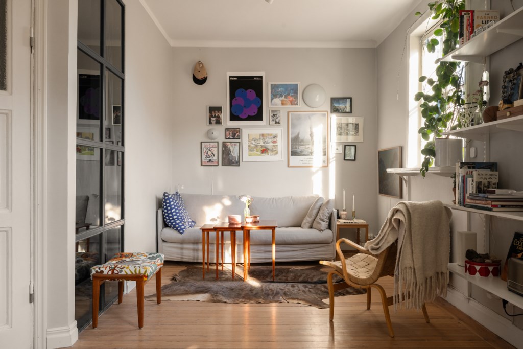 Ljust och härligt allrum med stort spröjsat fönster som vetter mot pittoreska Blecktornsgränd. för såväl skrivbord och säng som soffa och bokhylla. Väggarna är ljust målade och på golvet ligger vackert trägolv.