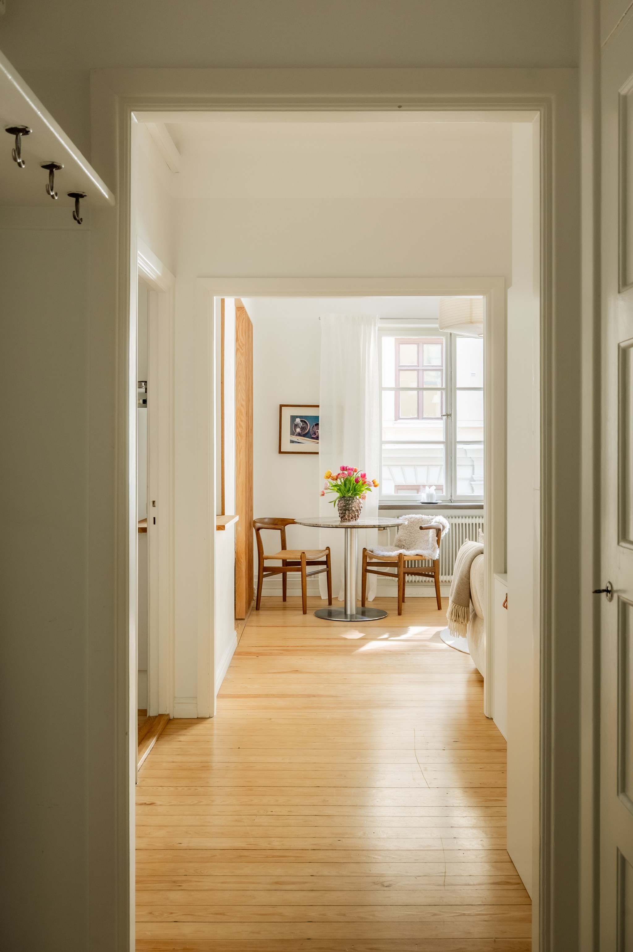 Trevlig hall med för ytterkläder och skor och inbyggd garderob. Gott om plats för andra förvaringslösningar om du önskar. Trägolv och ljusa väggar.