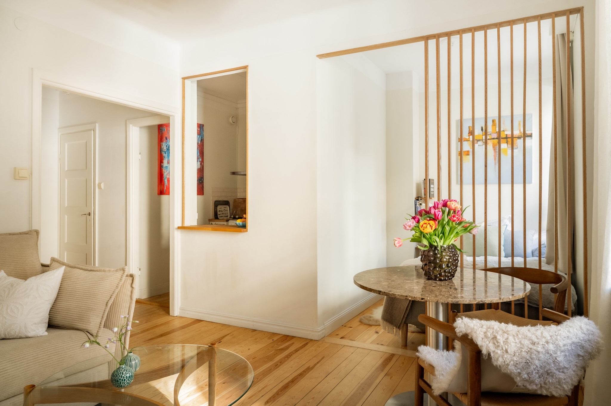 Mysig sovdel med spröjsat fönster och plats för 140 cm säng. (Idag står en 120 cm säng). Trägolv och ljusa väggar. Snygg träspaljé mot vardagsrummet.