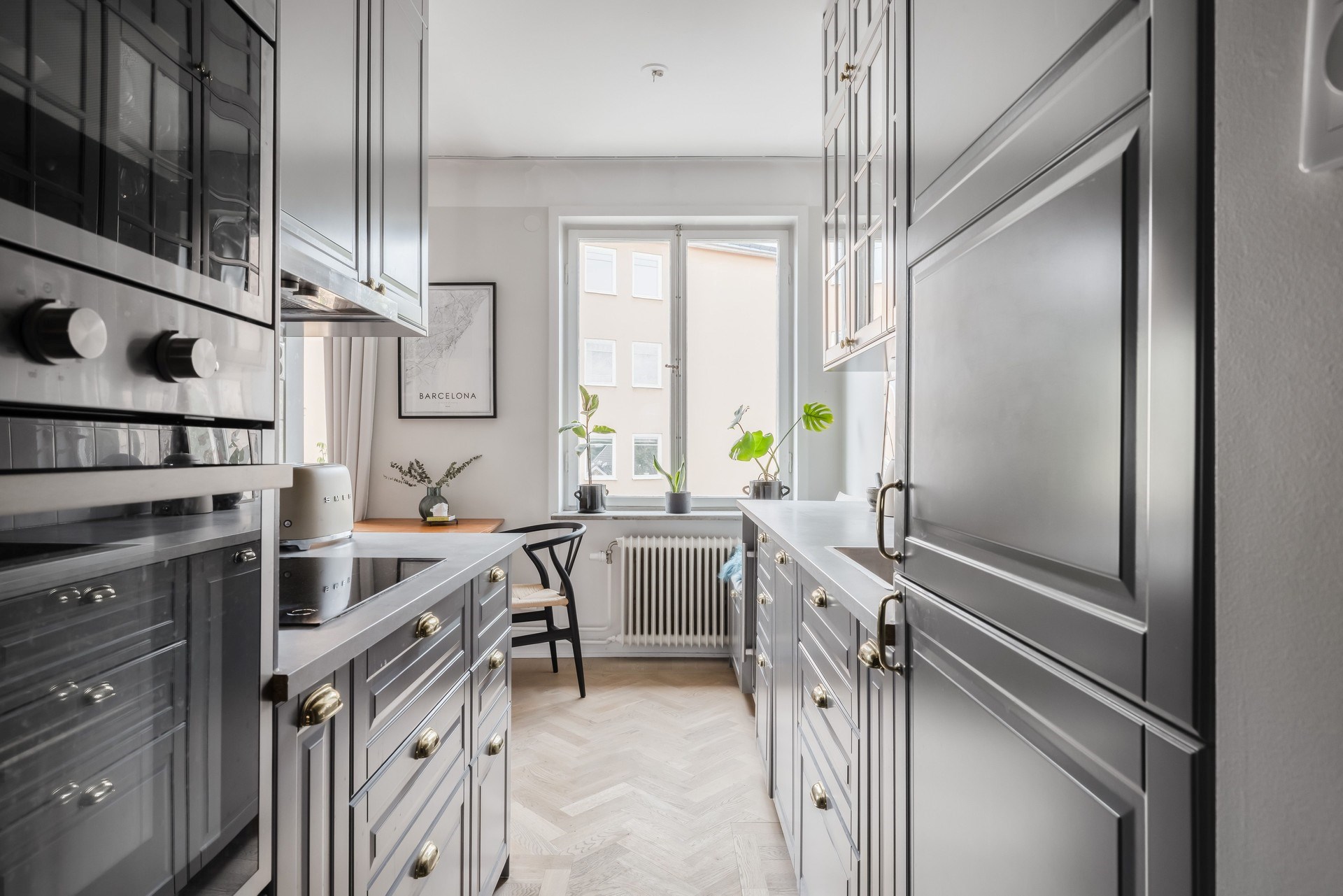 Smakfullt och mycket välplanerat kök med exklusiv känsla och sobra kulörval. Stilrena grå skåpluckor kombineras med ljus bänkskiva och gott om förvaring i både över- och underskåp. Köket erbjuder generösa arbetsytor.