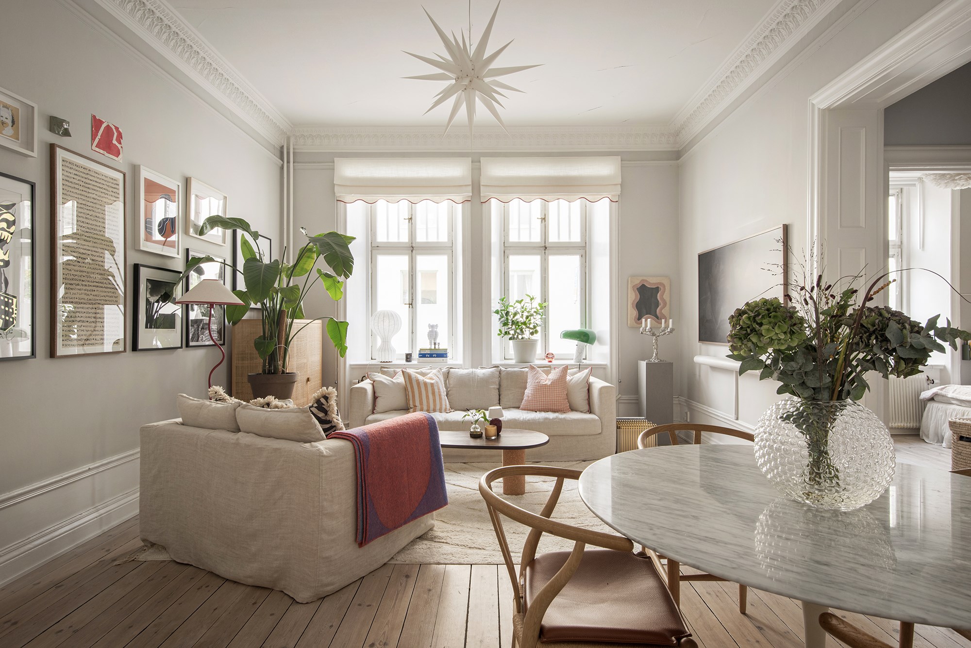 Plats för avhängning och ättare möblering. Redan här möts du av takhöjden och det vackra trägolvet.