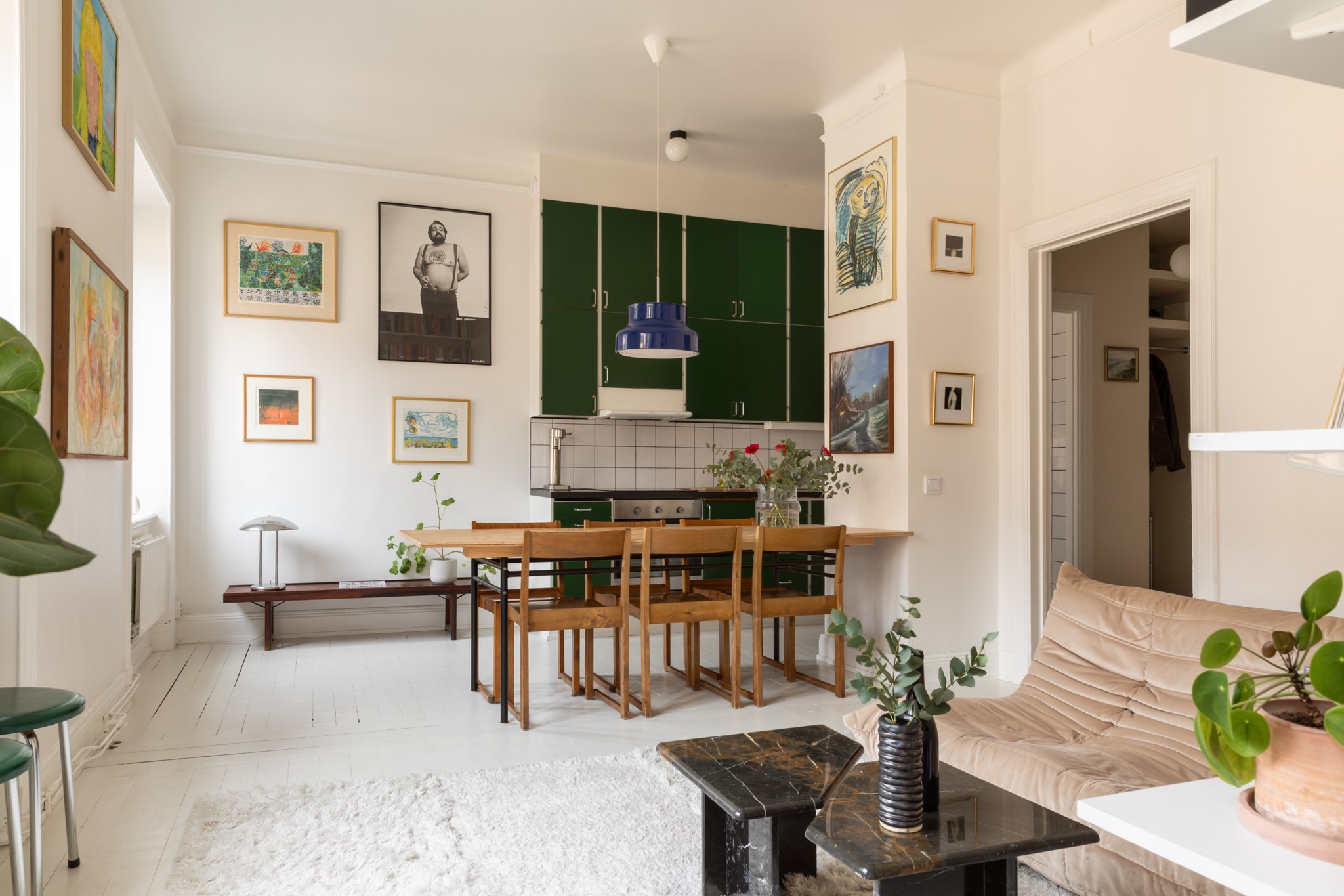 Rymligt och välplanerat kök med målade väggar och gröna fabrikssprejade skåpsluckor. Här finns generös förvaring och goda arbetsytor, perfekt för matlagning och sociala stunder. Delvis öppen planlösning mot vardagsrummet skapar luftiga ytor och ger plats för ett större matbord. Stora fönster släpper in rikligt med ljus. Köket är fullt utrustat med induktionshäll, ugn, kyl och frys i rostfri design, diskmaskin samt stilren blandare.