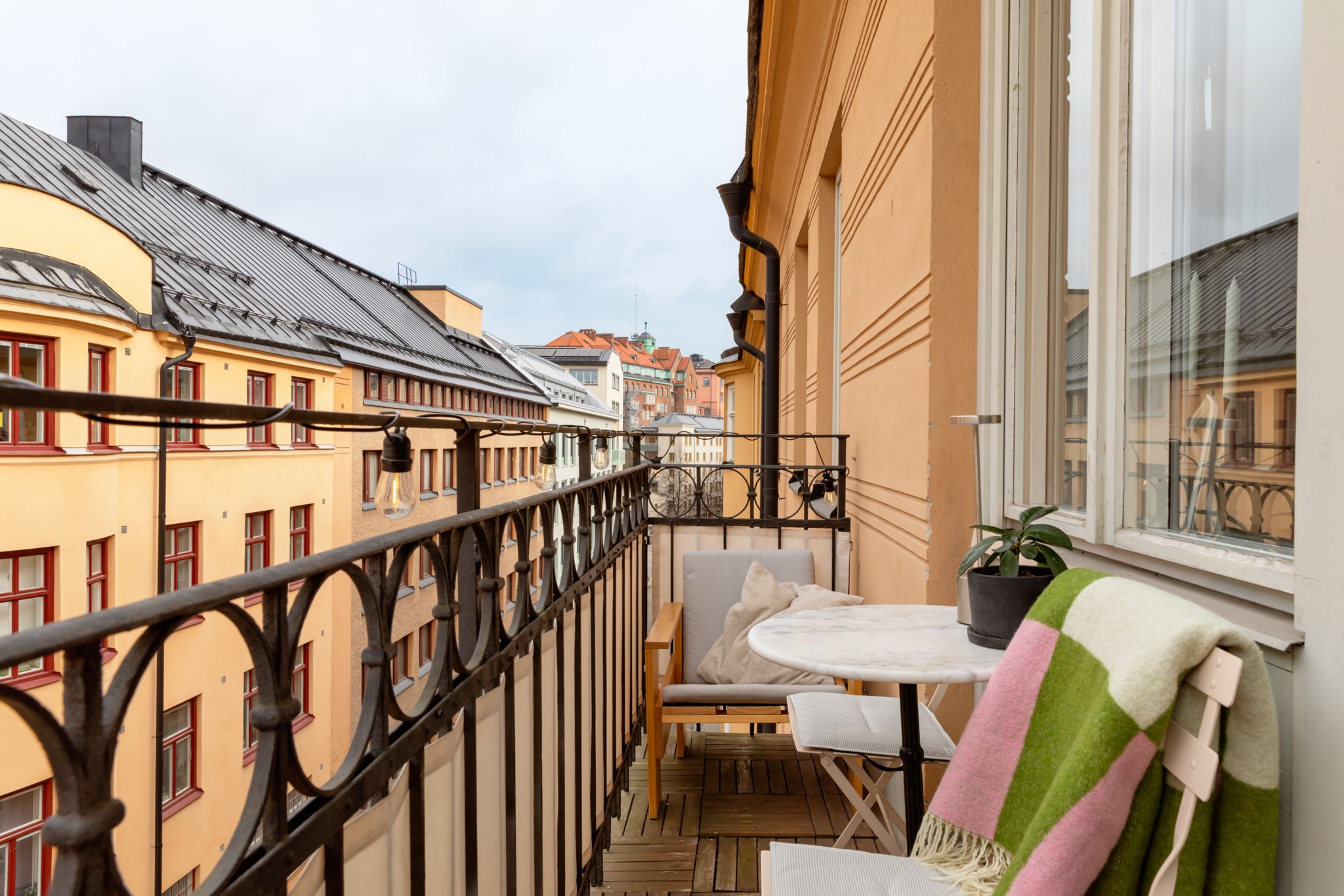 Ljuset faller fint genom de stora fönstren och förstärker känslan av rymd i bostadens sällskapsdelar. Från vardagsrummet nås balkongen som vetter mot gatan och erbjuder sol från eftermiddag till kväll – en naturlig förlängning av hemmet under årets varmare månader.