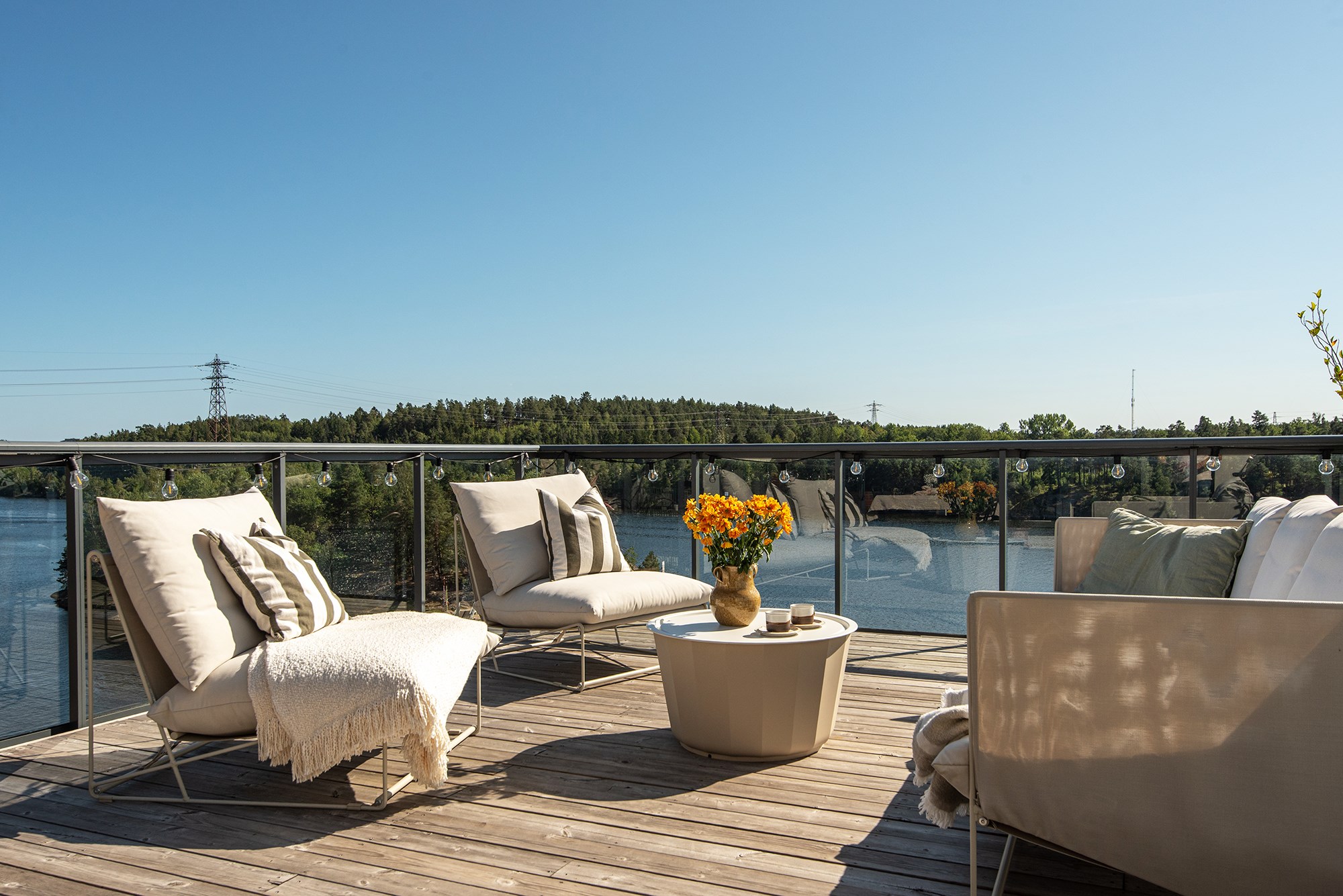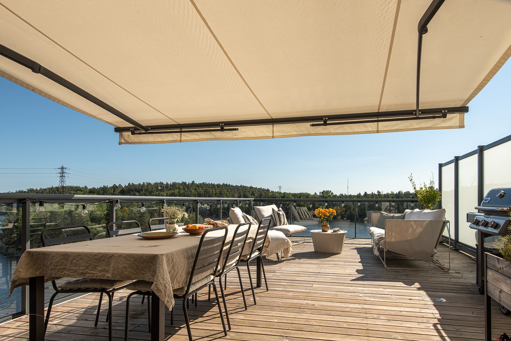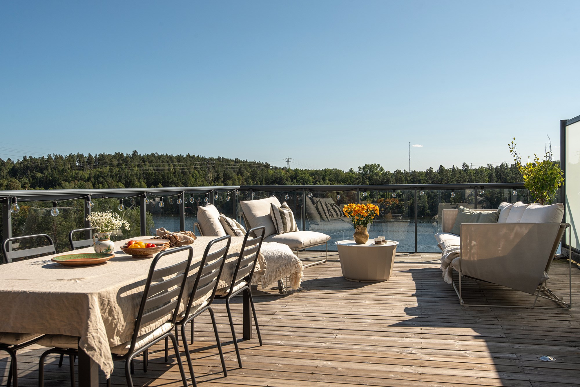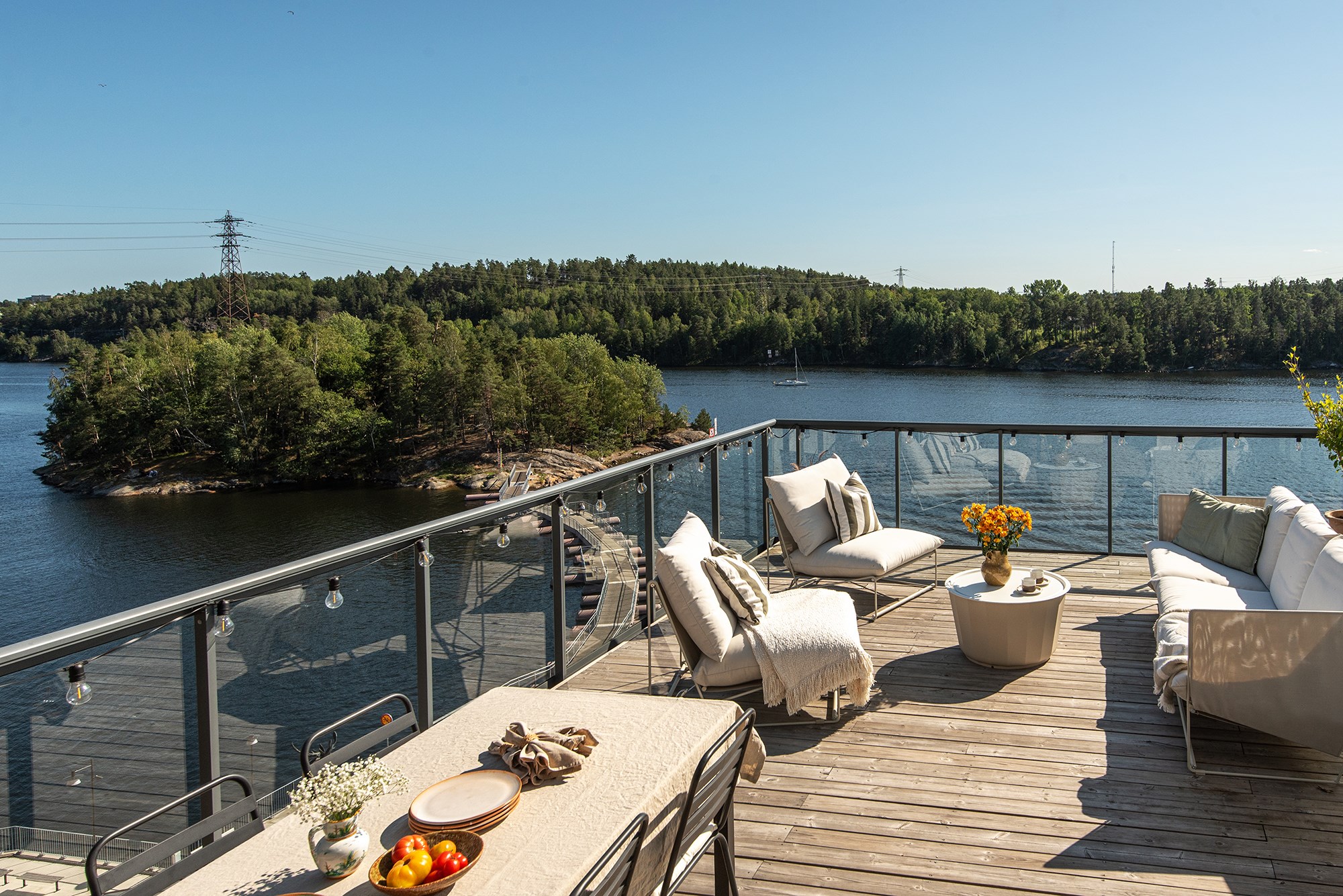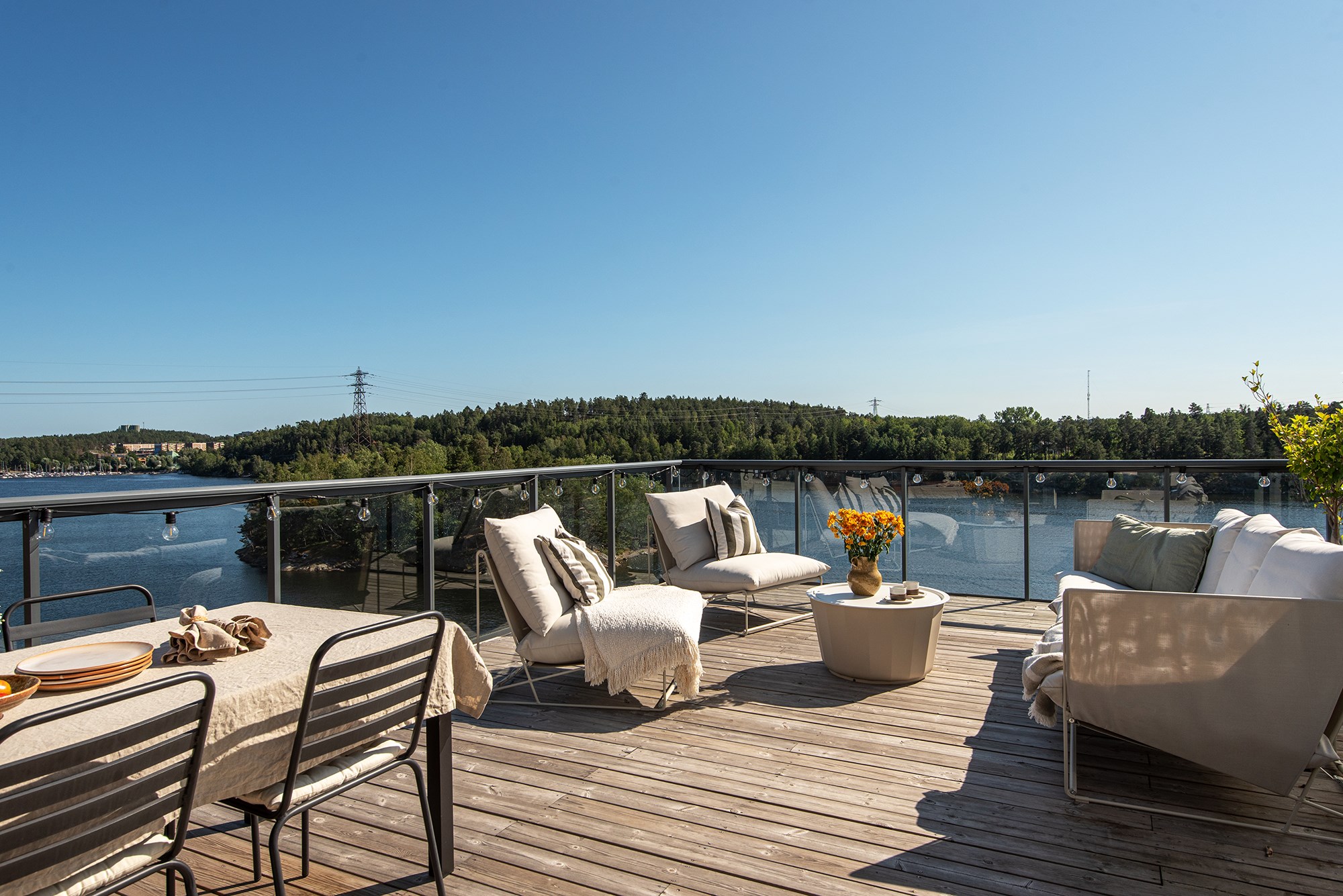 Svårslaget läge med underbar terrass precis vid vattnet! Högst upp i huset med enastående utsikt och sol nästan hela dagen är det här en ljuvlig plats att bo på. Välplanerad och ljus bostad med öppna sociala ytor i fint skick och med både inglasad balkong med morgonsol, och egen terrass om ca 40 kvm på frontläge och med sol från förmiddag till kvällen. En unik chans som sällan ges! På terrassen finns plats för stora sittgrupper, grill och planteringar. Duka upp för stora middagar med vänner och familj såväl under den stora markisen som utan när vädret tillåter.