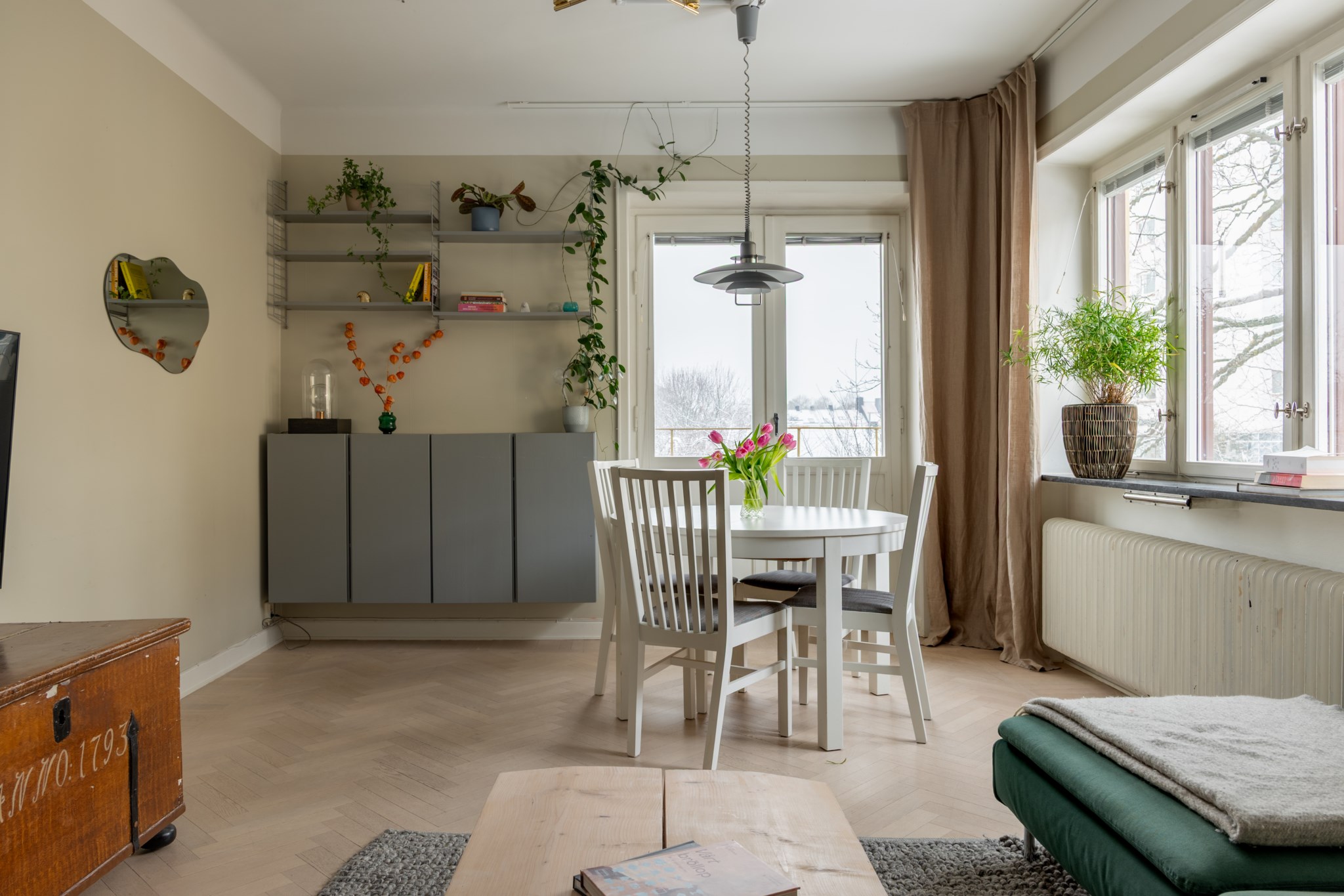 Redan i hallen möts ni av den ljusa fiskbensparketten som är genomgående i lägenheten. Här hänger ni av er jackorna och väskorna på den rymliga hallmöbeln till höger, som även har plats för skorna.