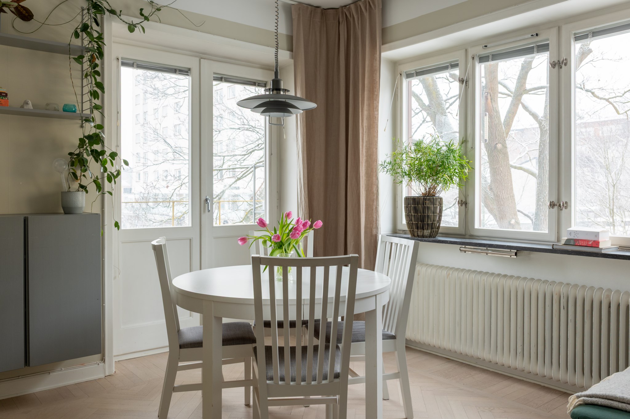 Inbäddad i grönska, med fönster i tre väderstreck ligger den här välplanerade och ljusa trerummaren. Det är ett harmoniskt boende där ljus fiskbensparkett på golvet möter en harmonisk färgskala på väggarna och vita snickerier. Fönstren är i originalutfärande vilket ger vackra fönstervred och fönsterbräden i mörk sten. Köket gör dig glad - här pryder en härlig mönstrad tapet ena väggen och matlagningen är enkel i det fint renoverade köket. Två sovrum med garderober och stort vardagsrum med utgång till balkong gör boendet komplett!
