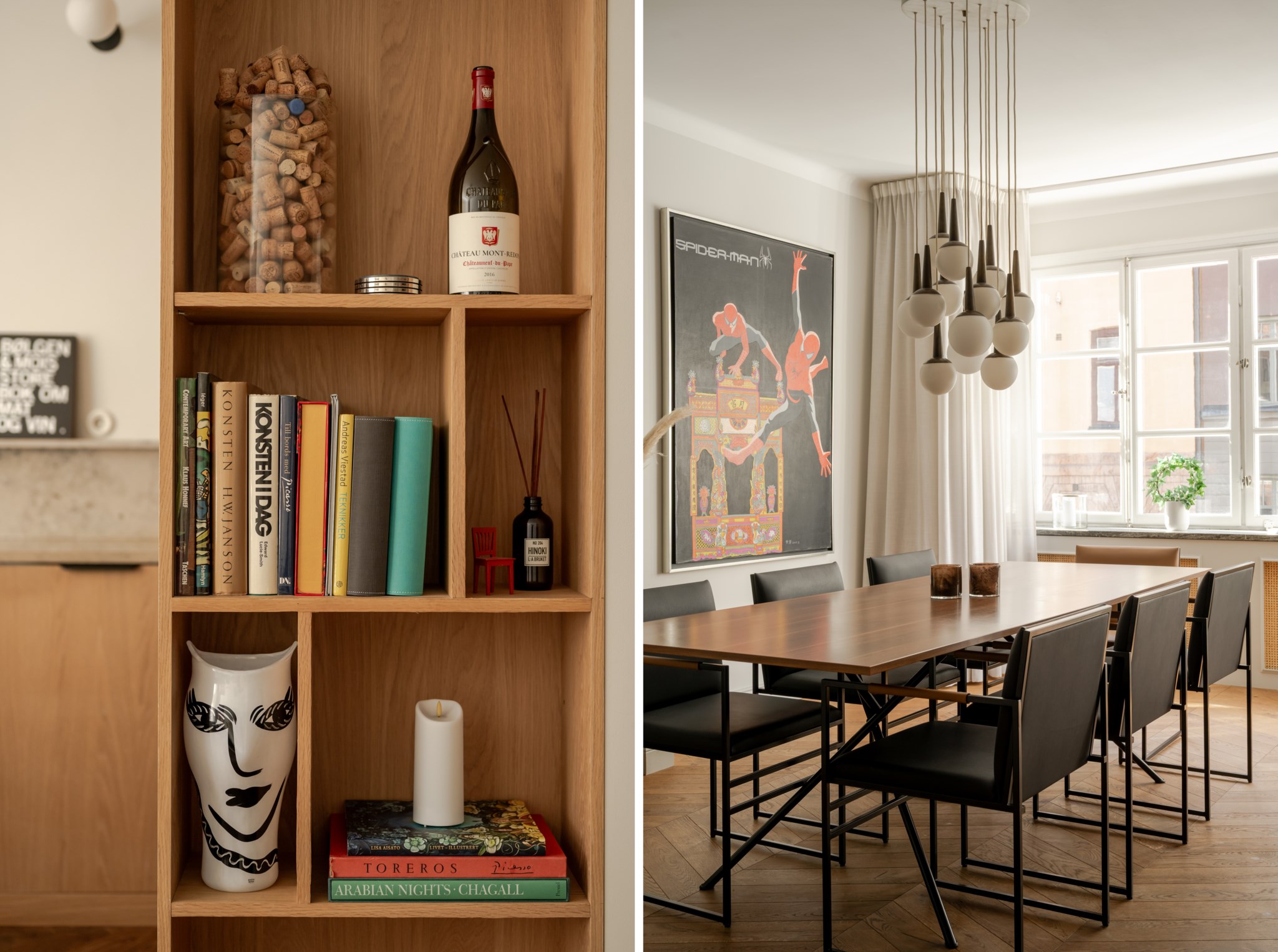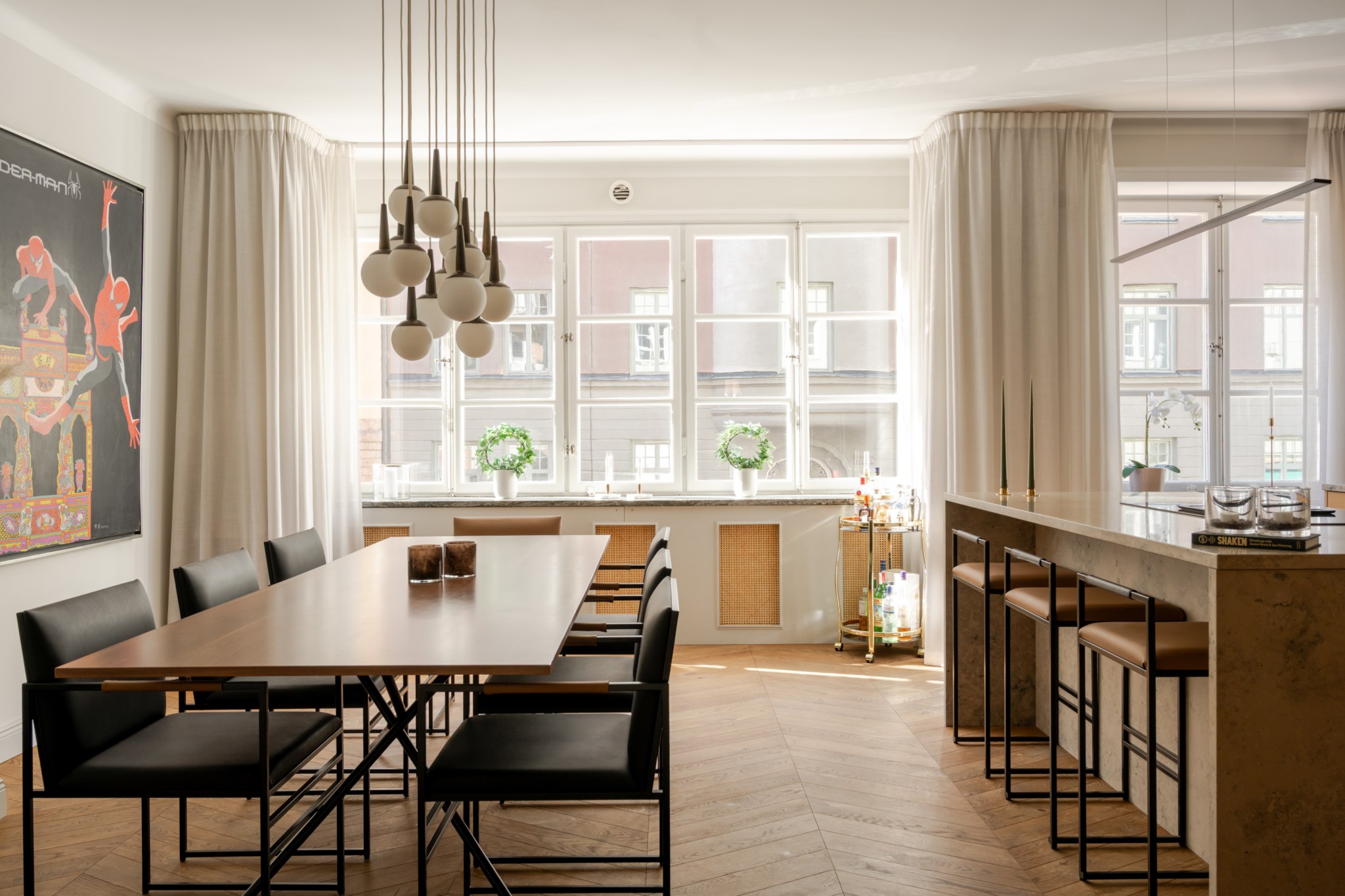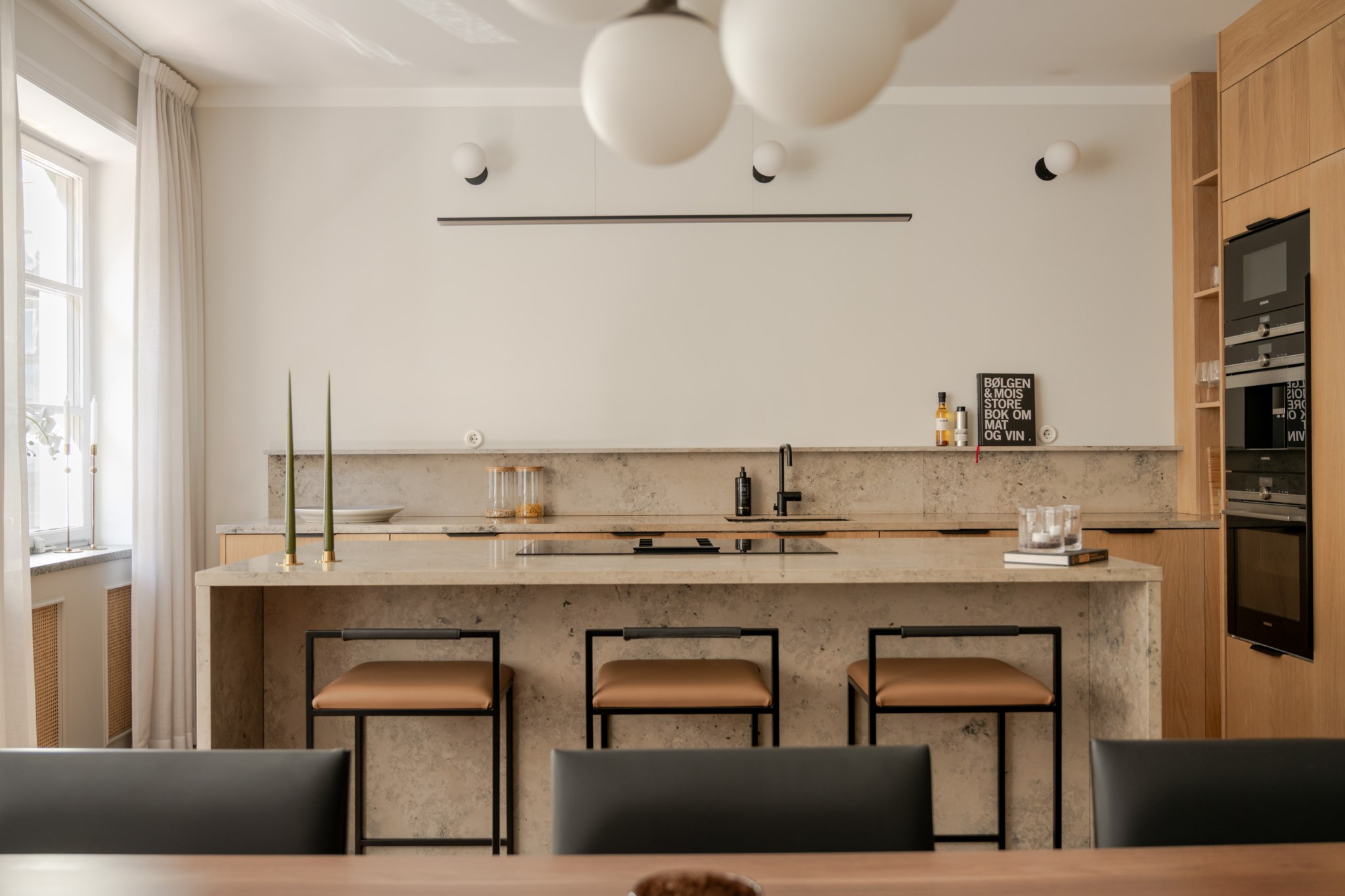 Smakfullt kök med luckor i trä och bänkskiva i Jura Grey. Magnifik köksö som utgör extra arbetsyta och inbjuder till trevligt häng. Köket är maskinellt fulländat och utrustat med integrerad kyl/frys samt diskmaskin, ugn, mikro, kaffemaskin, vinkyl samt induktionshäll med infälld fläkt.