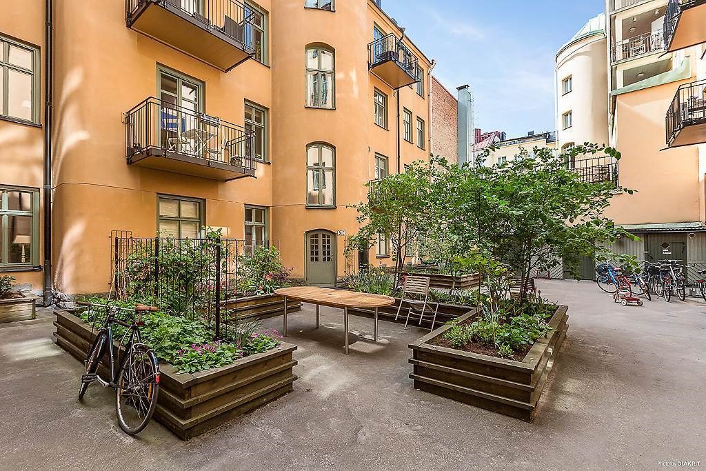 Fin gemensam innergård med sommarmöblering, planteringar och grill. Föreningen har ett skjul för sopsortering på gården för tidningar, glas och metall, en för hushållssopor och en för butikslokalernas sopor.