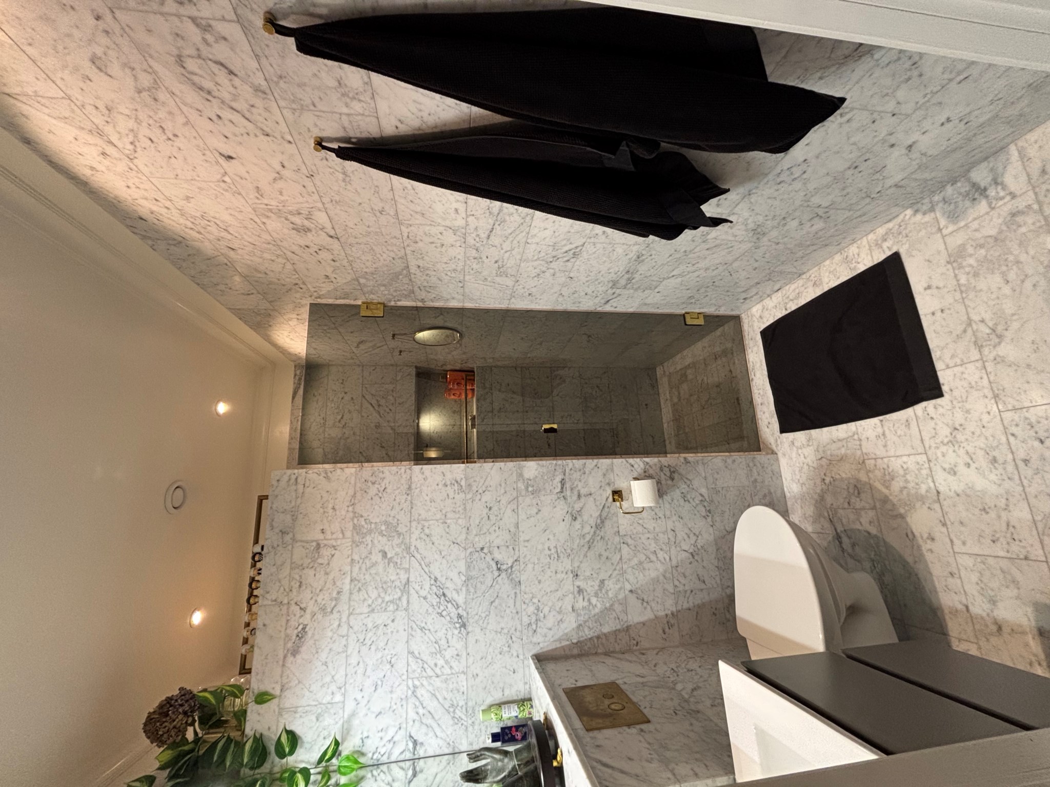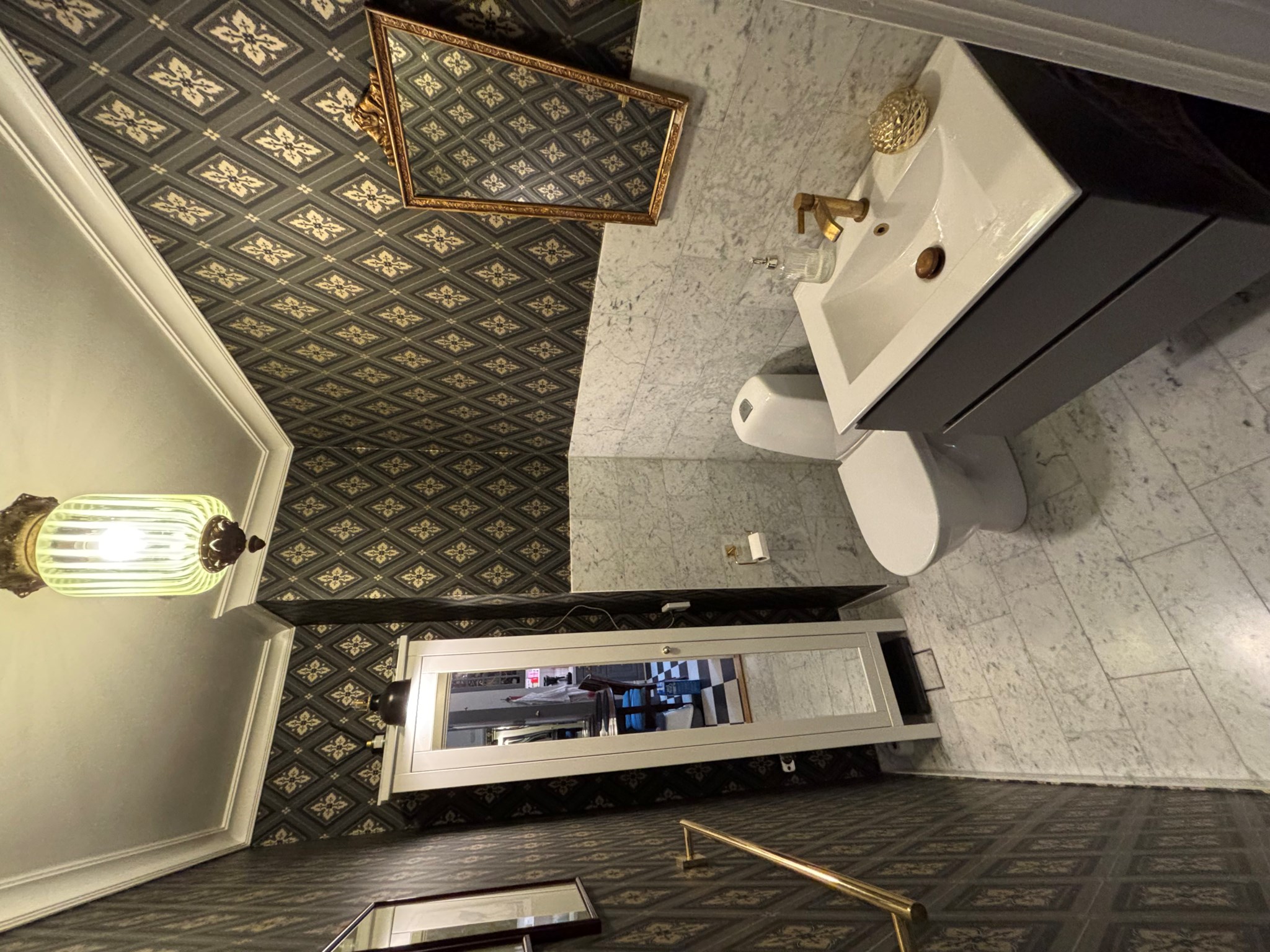 Två stilfulla badrum, färdigställda i januari 2023 i samband med föreningens stambyte, som håller hög standard. Det större badrummet är elegant inrett i Carraramarmor och utrustat med golvvärme, dusch, kommod, vägghängd WC. Därtill finns en smakfull gäst-wc i samma materialval. Här är det dessutom framdraget för tvättmaskin för extra komfort i vardagen. Tvättstugan i föreningen är nyrenoverad och har många effektiva maskiner. Hallen erbjuder goda avhängningsmöjligheter.