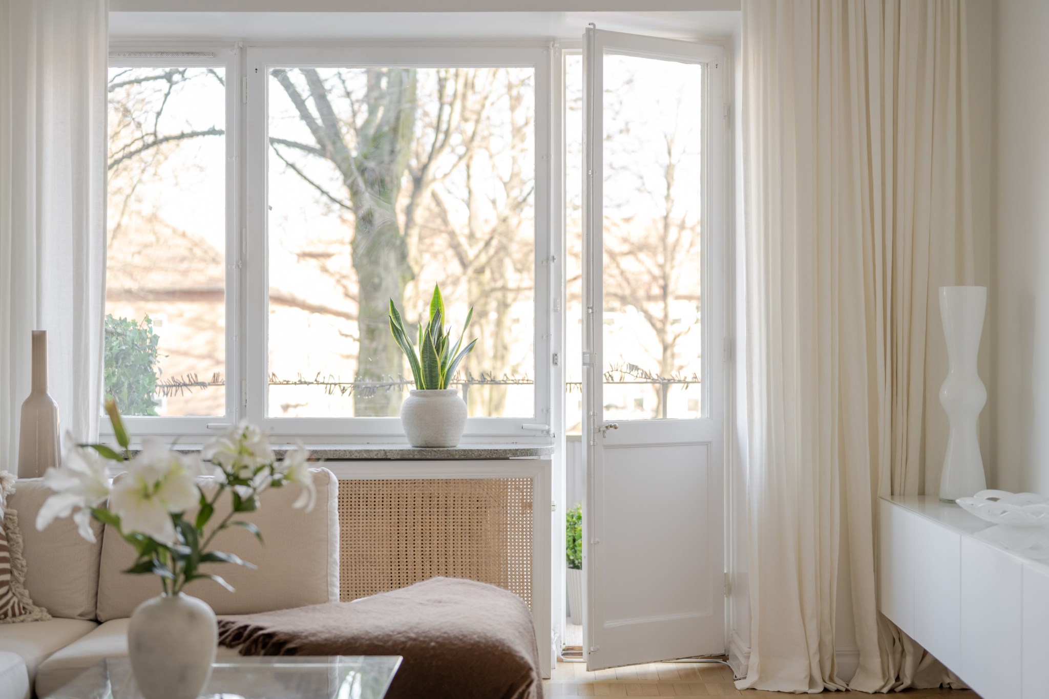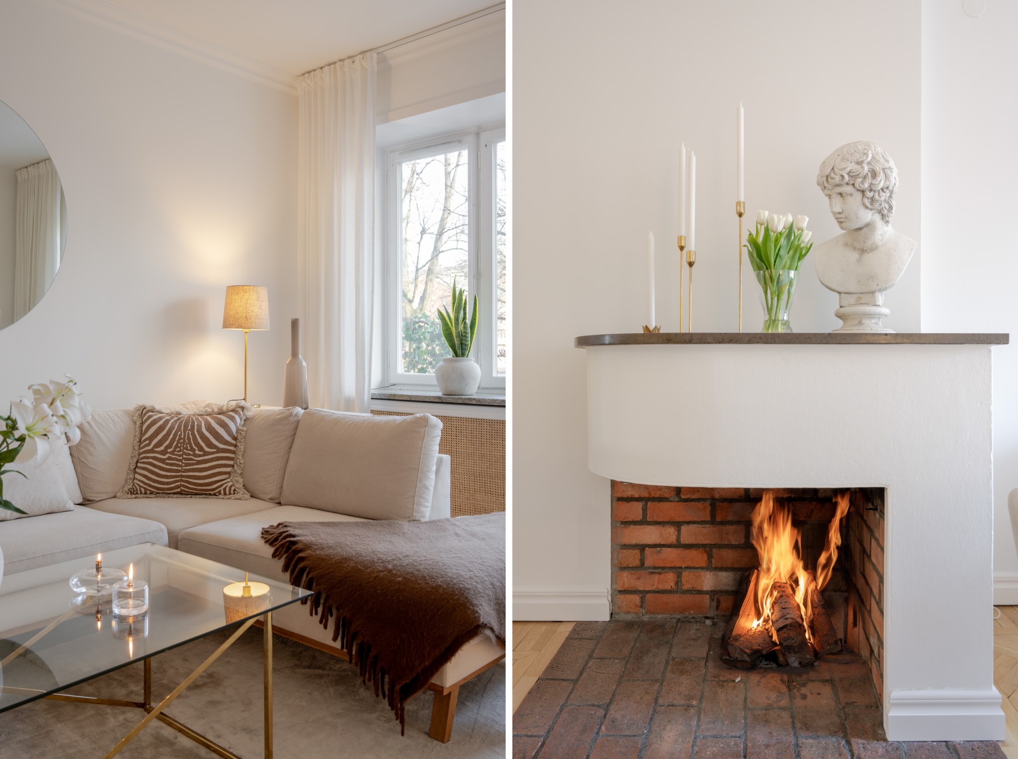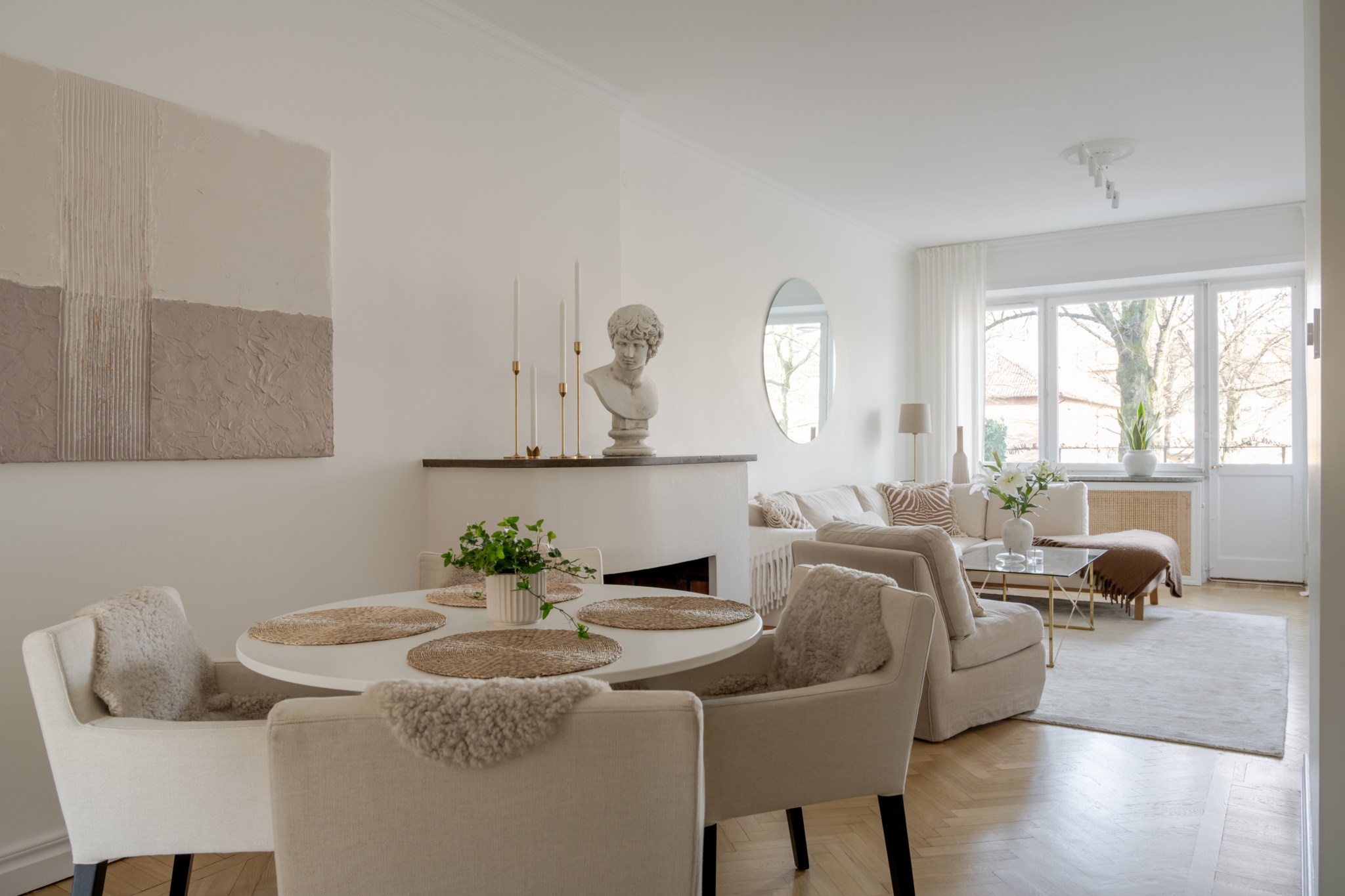 Lättmöblerat vardagsrum med ljusa väggar, fiskbensparkett och utgång till balkong. Naturlig matsalsdel mellan köket och vardagsrummet med öppen spis och plats för stort matbord.