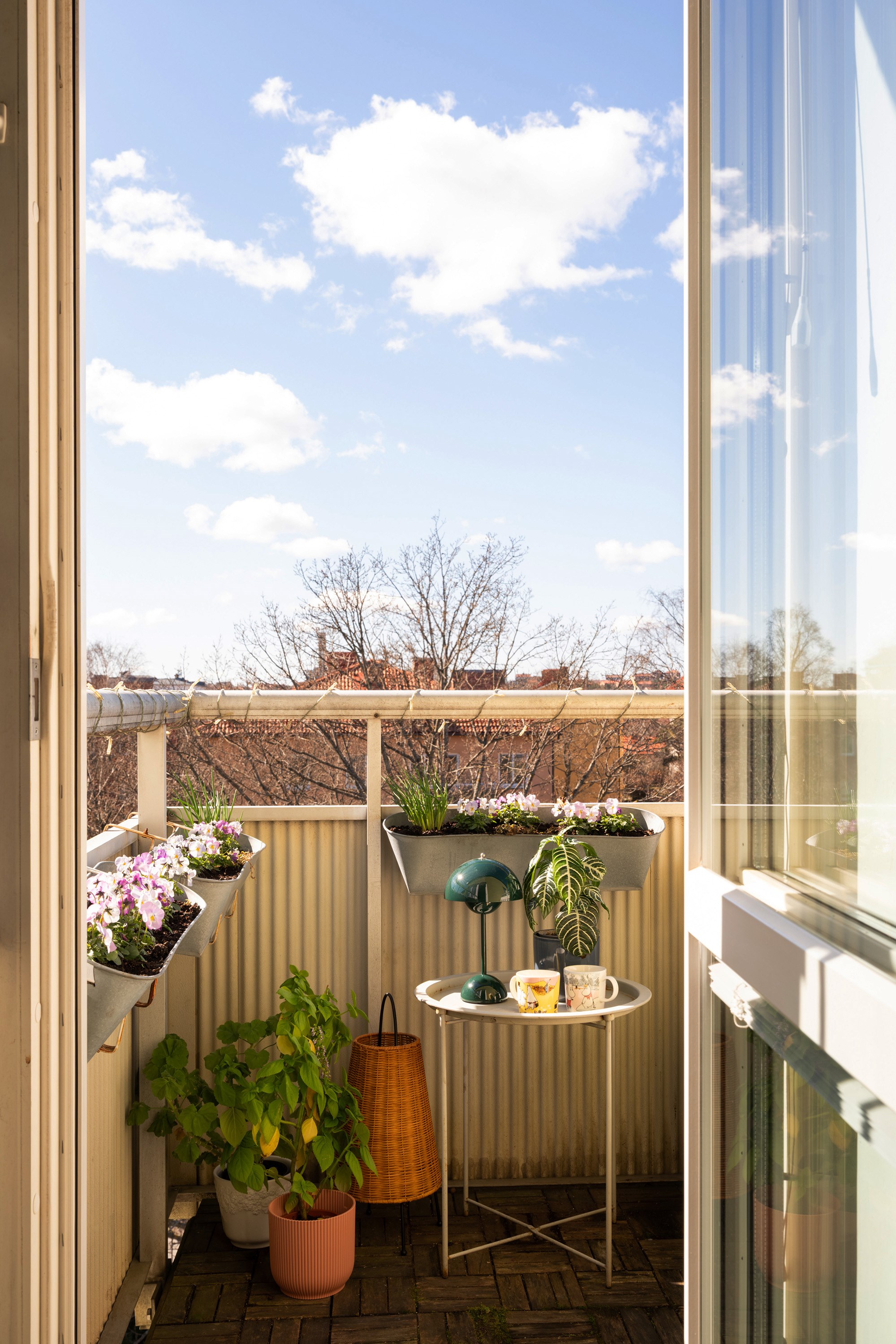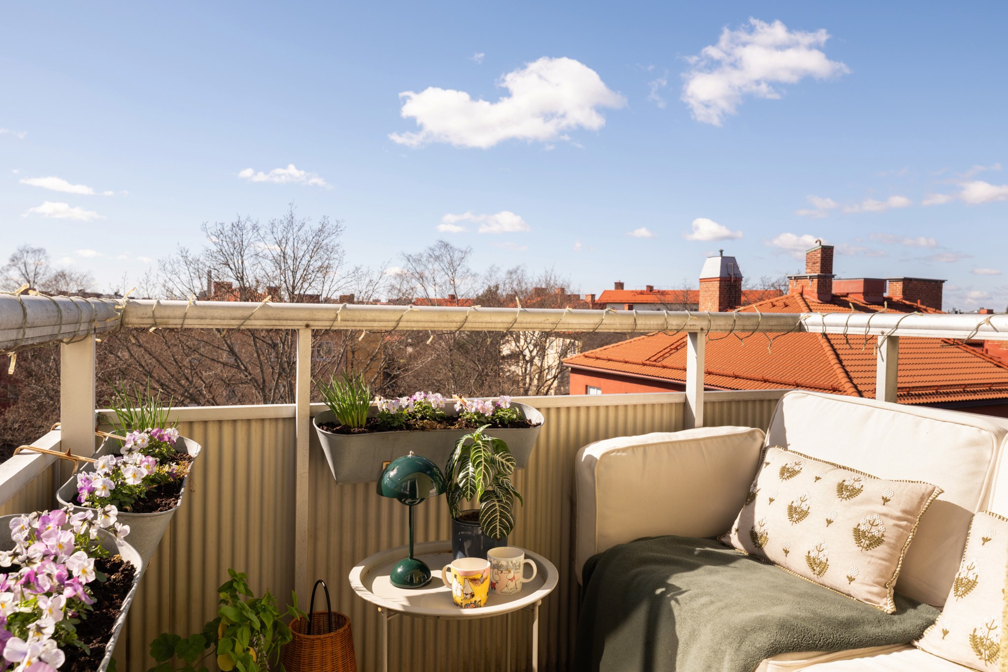 Möblerbar balkong i soligt söderläge omgiven av trädkronor och takåsar. Läget ger sol större delen av dagen till kväll.