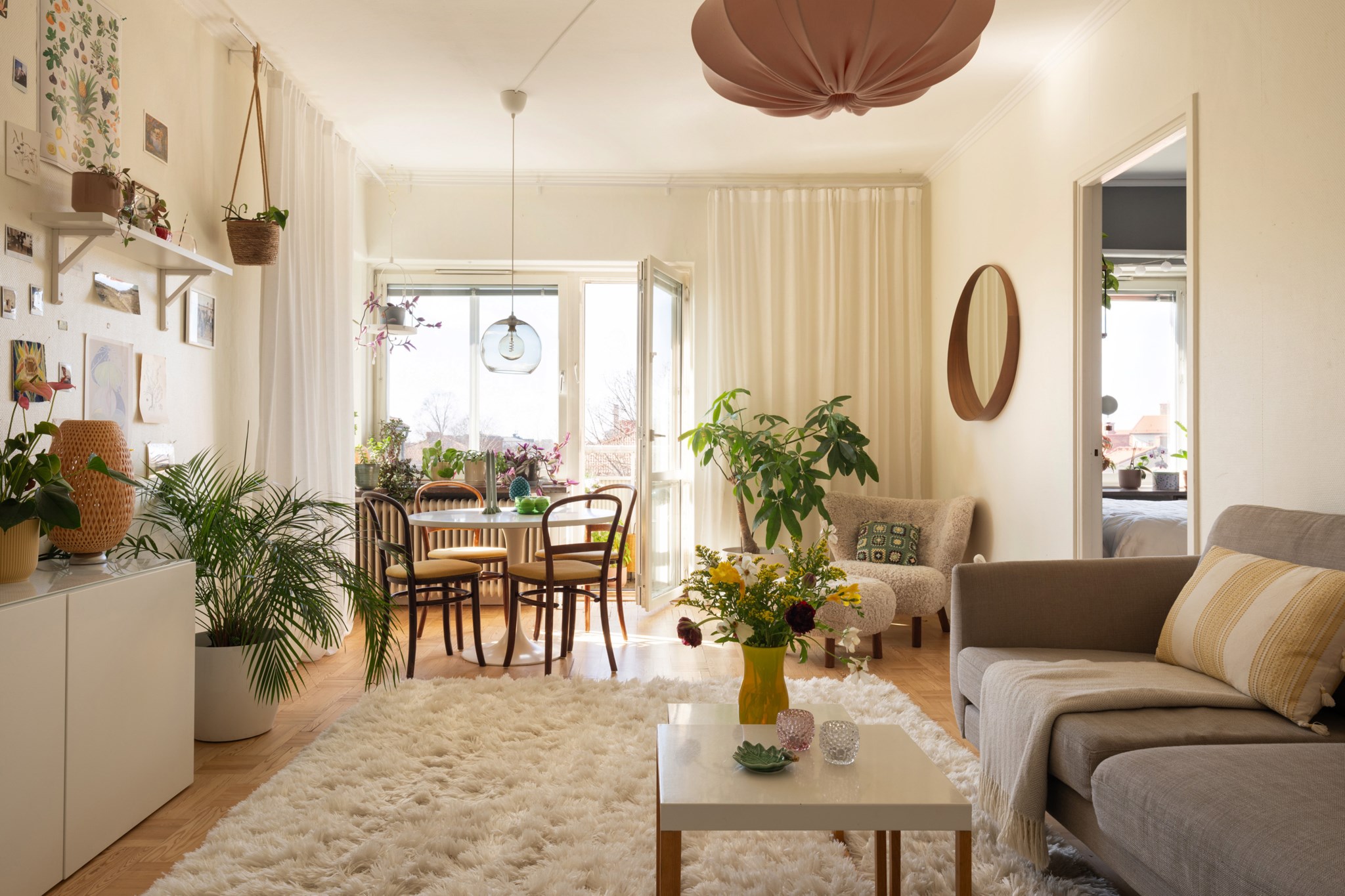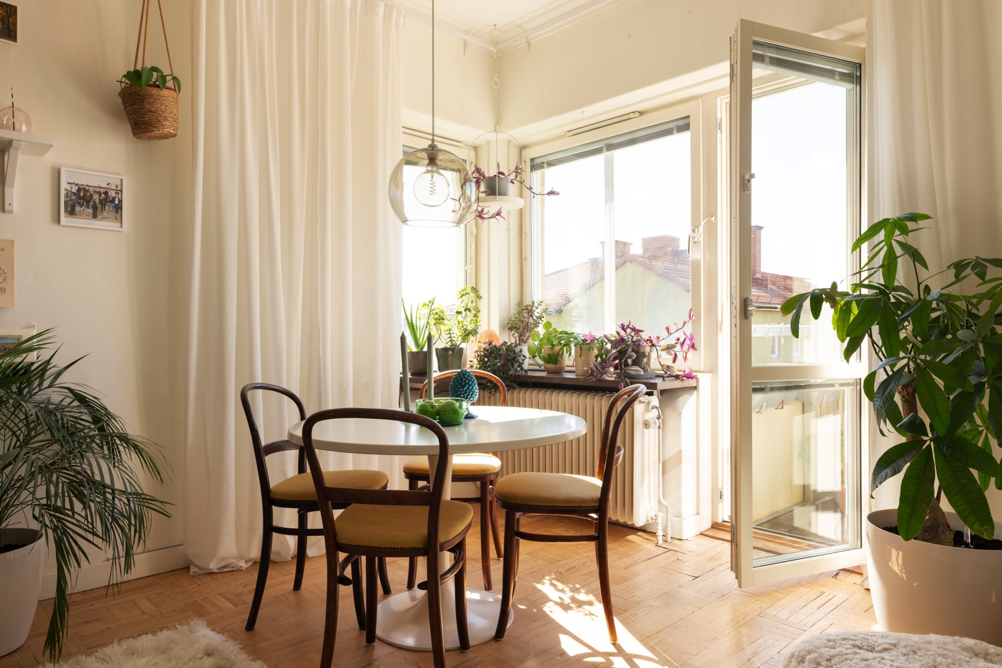 Fullkomligt magiskt sällskapsrum som ihop med fönster i två väderstreck och utgången till balkongen ger rummet en fantastisk rymd och atmosfär. Lättmöblerad yta med plats för såväl rymlig soffgrupp som middagsbord åt stora sällskap.