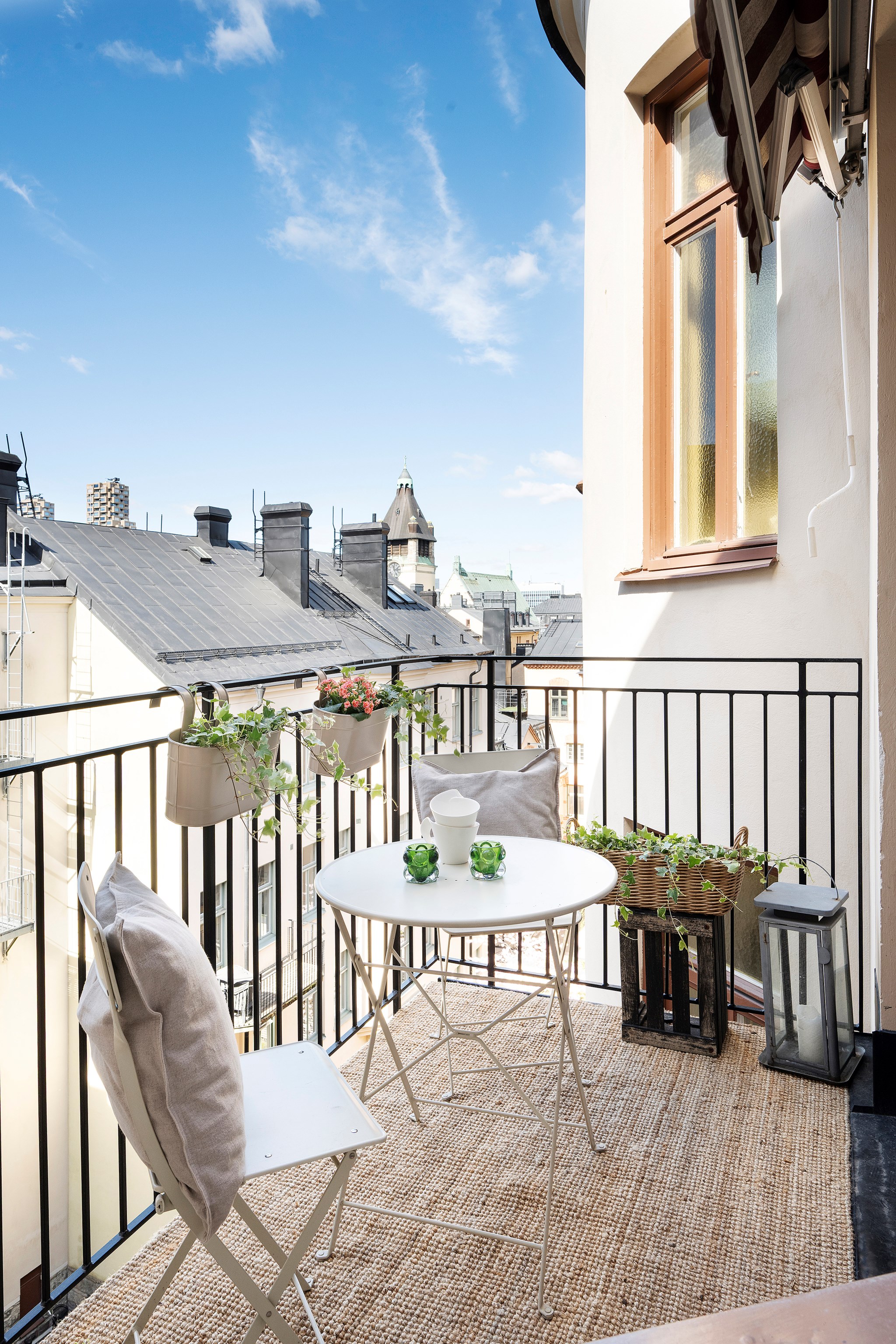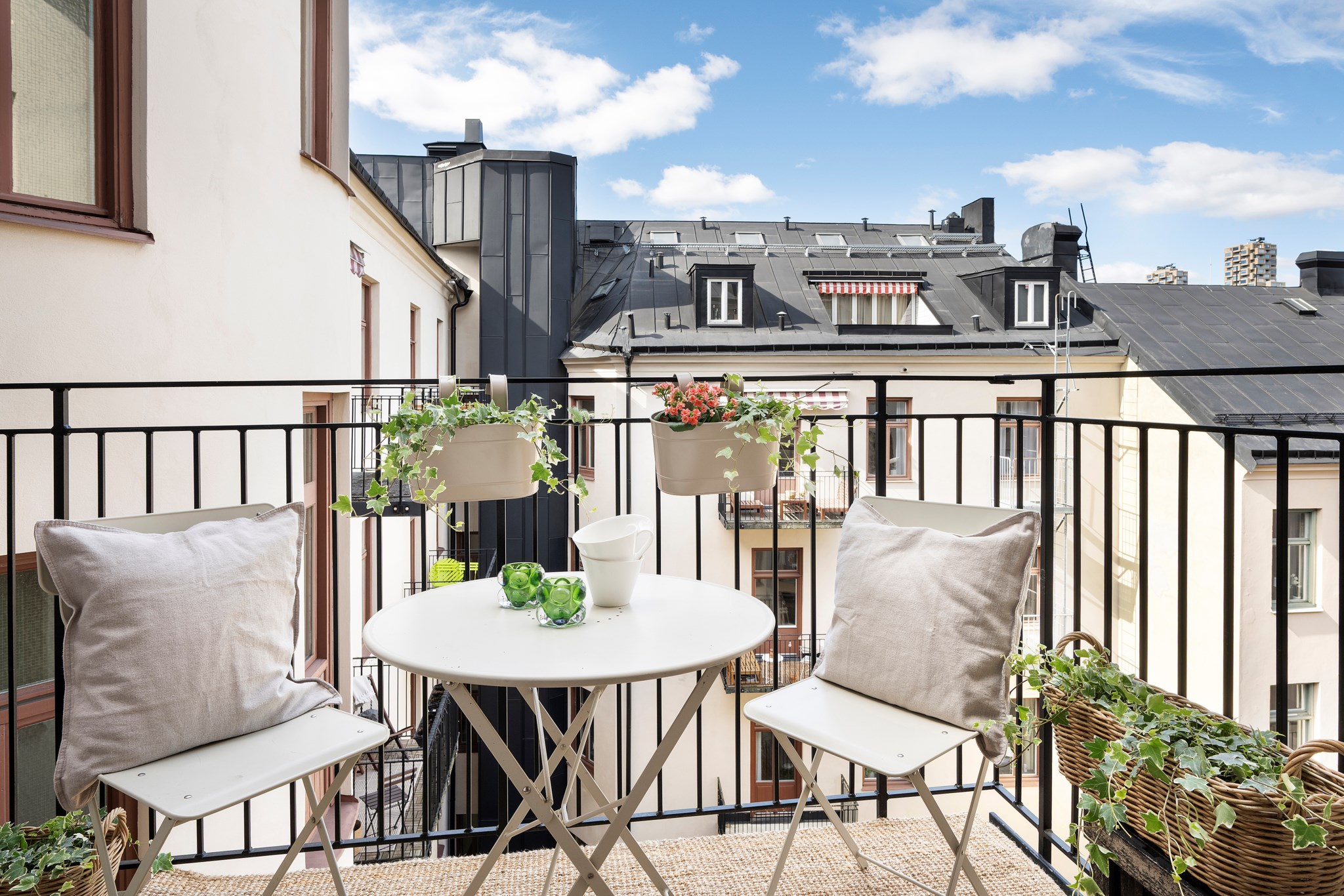 Stor och solig balkong i högt läge in mot gård i sydväst, här har man sol från ca 14.00-21.00 sommartid.