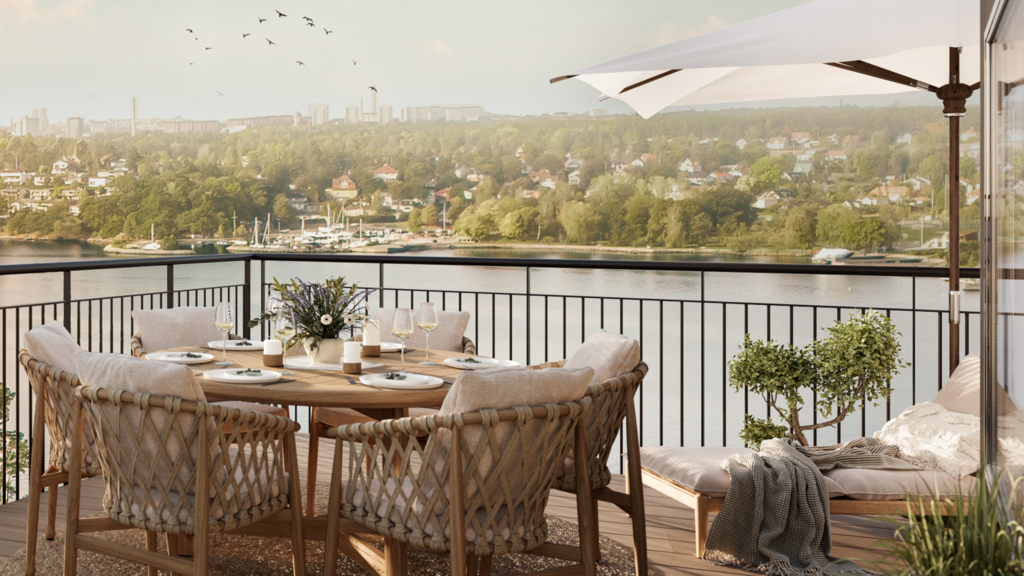 Den generösa terrassen om ca 19 kvm blir en naturlig samlingspunkt för både avkoppling och sociala tillställningar. Här kan du njuta av lugna morgnar med kaffekoppen i handen eller långa sommarkvällar med vänner och familj, allt med en utsikt som tar andan ur dig.