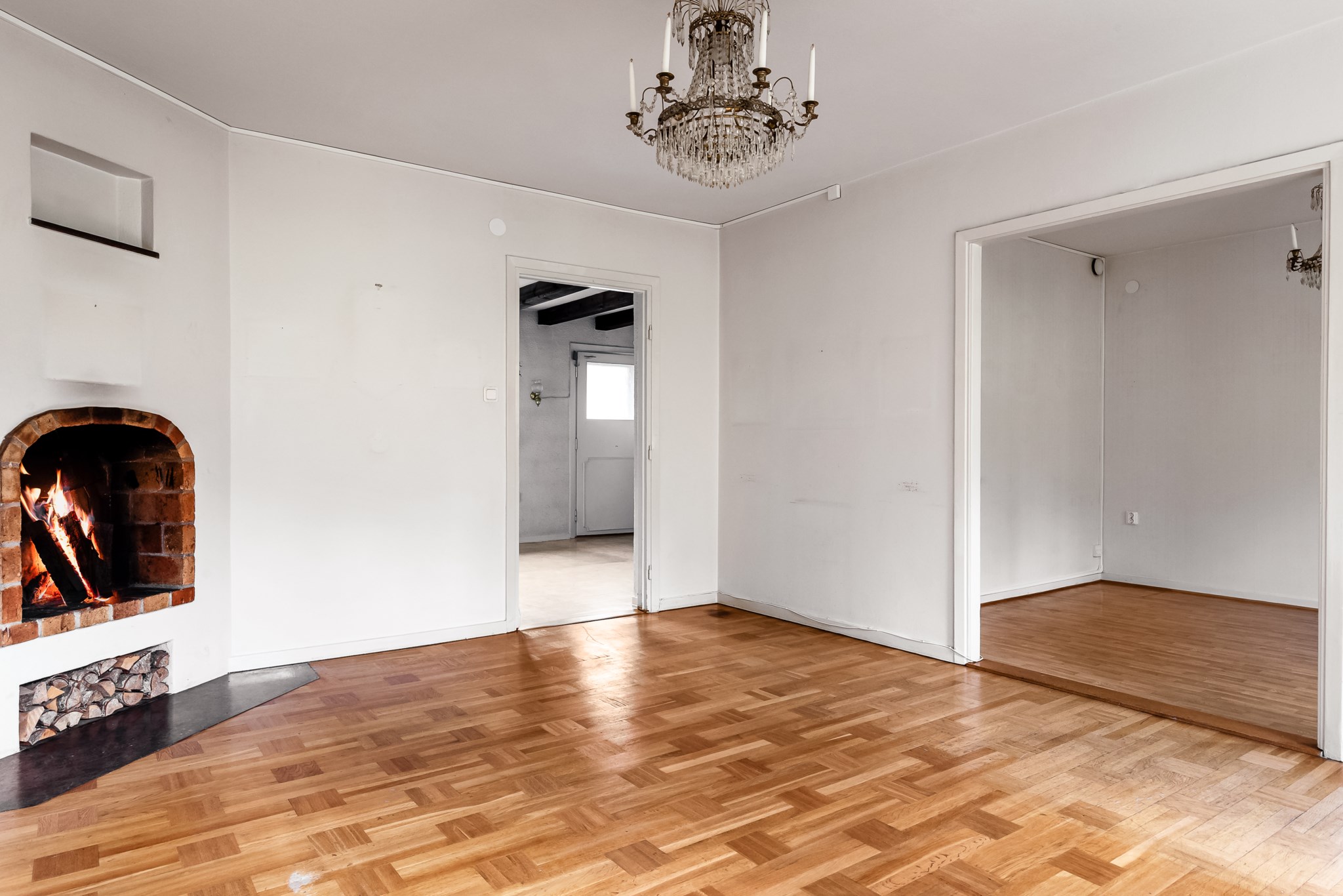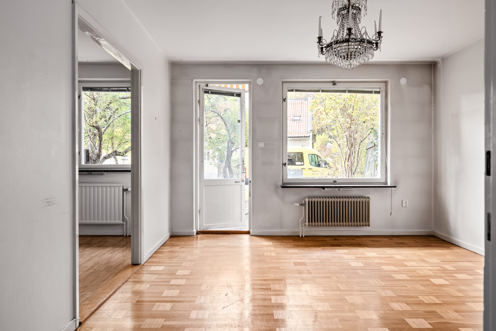 Underbart vardagsrum med ett stort fönsterparti och utgång till den härliga trädgården med sina många soltimmar. Originalparkettgolv och ljusa väggar. I rummets ena hörn finns en tidstypisk och fungerande öppen spis som värmer härligt den kallare delen av året.