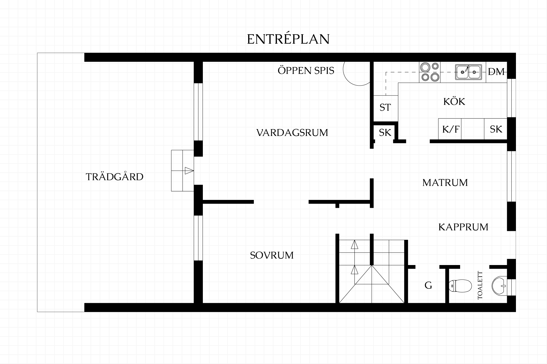 Välkomnande hall med ingång till gäst-wc och en fast garderob. Har tidigare varit en spaljé med kapphängare som tagits bort men kan lätt återskapas så att hallen blir mer åtskild från matrummet. På golvet ligger det en plastmatta som även sträcker sig in i matrum och kök.