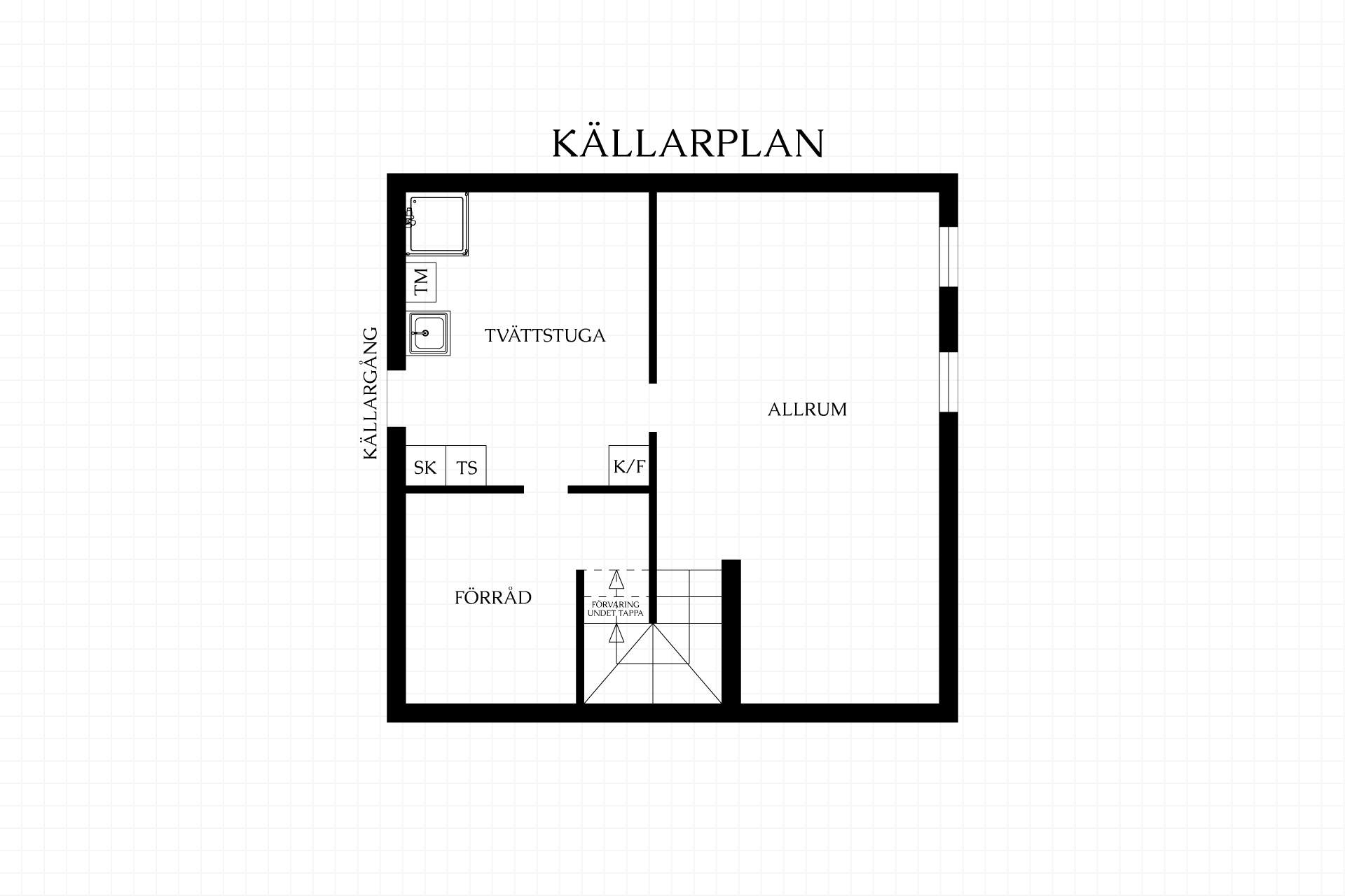 Rymlig källare om 47kvm. Här finns många möjligheter och man kan förslagsvis bygga till ytterligare ett sovrum samt ett större badrum. Idag finns det ett större allrum med två fönster och en enklare tvättstuga med duschkabin. Det finns även en till entré i källarplanet som leder ut i källargången och vidare ut på gatan.