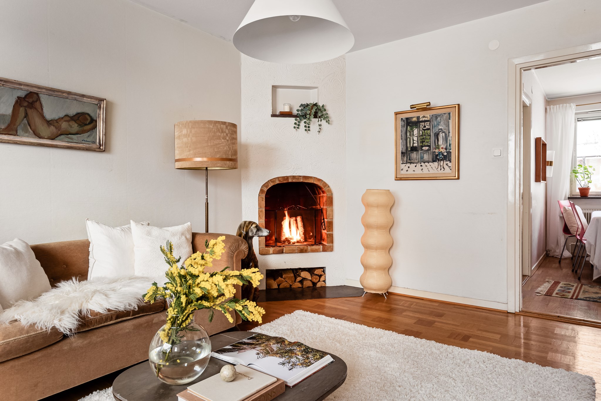 Underbart vardagsrum med ett stort fönsterparti och utgång till den härliga trädgården med sina många soltimmar. Originalparkettgolv och ljusa väggar. I rummets ena hörn finns en tidstypisk och fungerande öppen spis som värmer härligt den kallare delen av året.